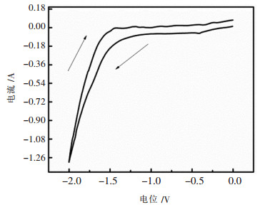 | 图 2 温度为1 373 K,扫描速率熔盐体系20 %LiF-22 %CaF2-58 %BaF2(摩尔百分比)循环伏安曲线 Fig. 2 Cyclic voltammetry of molten salt system 20 % LiF-22 % CaF2-58 % BaF2 (mole percent) at 1 373 K |