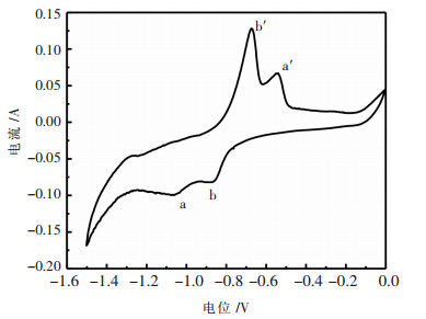 如图 3所示为温度1373K下,扫描速率0.1v/s, 加入质量分数为0.5 %二氧化锆的循环伏安曲线图.相对于参比电极铂,电势-0.87V和-1.07V的位置分别出现还原峰a和b, 电势-0.54V和-0.67V的位置分别出现对应的氧化峰a’和b’, 从图中初步判断Zr4+在钨电极上还原过程是通过两步电子转移完成.