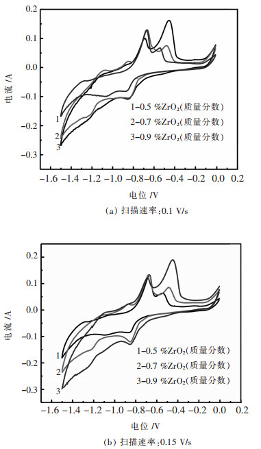 研究Zr4+在20 %LiF-22 %CaF2-58 %BaF2(摩尔百分比)电解质体系的阴极电化学行为, 避免实验出现两对还原氧化峰的偶然性,对含不同质量分数二氧化锆(0.5 %, 0.7 %, 0.9 %)的LiF-CaF2-BaF2-ZrO2熔盐体系,在温度1373K条件下进行不同扫描速率的循环伏安法测试, 如图 4(a)~图 4(b)所示.