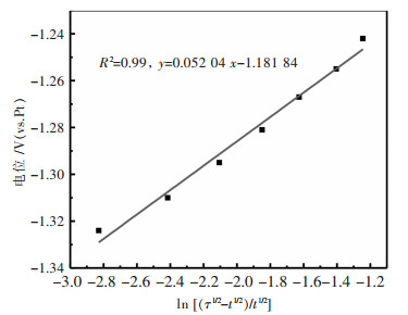 式(3) 中:E为电位,V;C为常数;R是气体常数,8.314 J/(mol·K),T为热力学温度,K,n为转移电子数,F为法拉第常数,96 485 C/mol,τ为过渡时间,t为时间.作E-ln[(τ1/2-t1/2)/t1/2]关系图,结果如图 8所示.