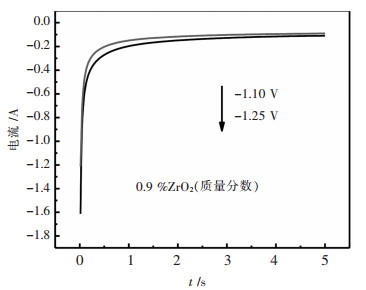 2.3 计时电流法在Zr4+转变为Zr的电势范围内对熔盐体系进行计时电流曲线的测量, 如图 9所示为原料质量分数0.9 %ZrO2的计时电流图.