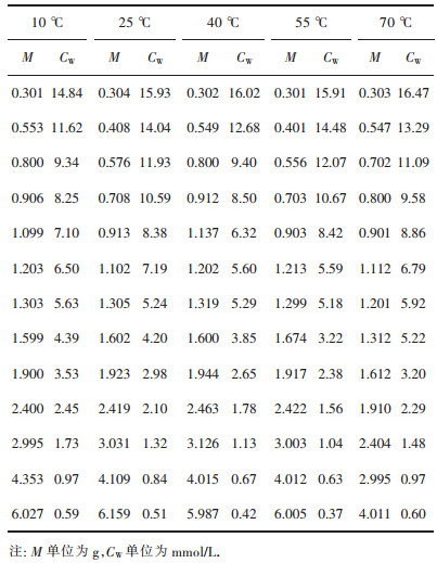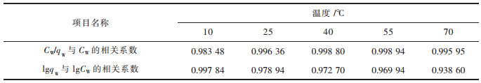 | 表 2 不同温度下CW/qW与CW、lgqW与lgCW的线性相关系数 Table 2 Linear correlation coefficients of CW/qW to CW and lgqW to lgCW at different temperatures |
