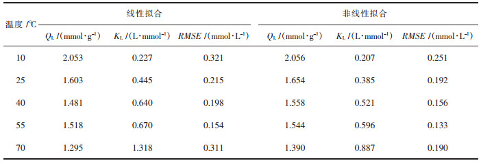 2)求算Langmiur模型常数项时,比较了线性拟合和非线性拟合2种方式对实验数据的拟合精度.各考察温度下非线性拟合的均方根误差均小于线性拟合的结果,表明非线性拟合的精度更高.