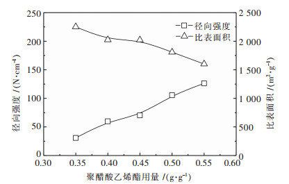 | 图 2 聚醋酸乙烯酯用量对成型炭性能的影响 Fig. 2 Effect of the amounts of polyvinyl acetate on characteristics of shaped activated carbons |