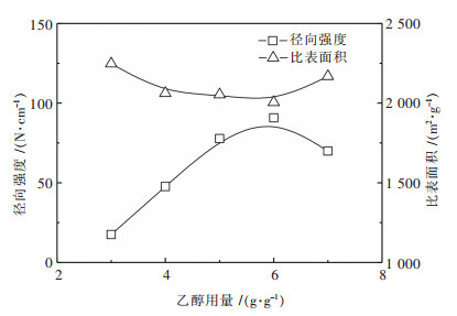 2.2 乙醇用量的影响在操作条件为聚醋酸乙烯酯用量(黏结剂/活性炭)0.45 g/g、加水量3.5 g/g(水/黏结剂)、固化温度100 ℃和固化时间60 min下,考察不同乙醇用量对成型炭的影响,乙醇用量(乙醇/黏结剂)分别为3 g/g、4 g/g、5 g/g、6 g/g和7 g/g,其结果见图 3所示.