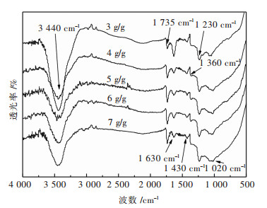 图 4所示为不同乙醇用量制备的成型炭红外谱图,红外谱图中存在的峰形及对应的特征峰归属列于表 3中,主要存在6种特征峰,其中1号峰的存在可能是由于活性炭吸附空气中的水分羟基所表现出的峰形;2、4和5号峰是聚醋酸乙烯酯的特征峰;3和6号峰可能是活性炭本身所带的芳环结构.从图 4中可以看出,随着乙醇用量的增加,2和4号峰强度不断增大,说明乙醇的加入有利于聚醋酸乙烯脂的交联固化;当乙醇用量达到5 g/g时,2号峰强度基本不变,4号峰强度在乙醇用量为7 g/g时,反而有所减弱,说明乙醇量过多时,反而抑制了聚醋酸乙烯酯的交联固化过程.根据上述分析,选乙醇用量为5 g/g进行后续实验.