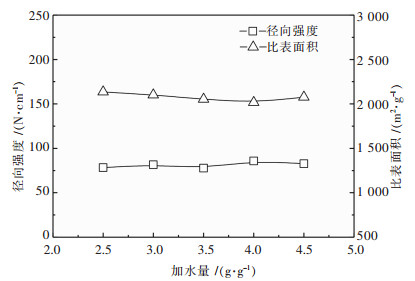 在操作条件为聚醋酸乙烯酯用量(黏结剂/活性炭)0.45 g/g、乙醇用量(乙醇/黏结剂)5 g/g、固化温度100 ℃和固化时间60 min下,考察不同加水量(水/黏结剂)对成型炭的影响,加水量分别为2.5 g/g、3.0 g/g、3.5 g/g、4.0 g/g和4.5 g/g,其结果见图 5所示.