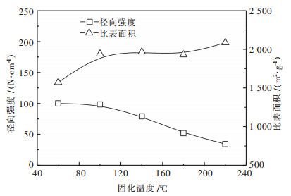 2.4 固化温度的影响在操作条件为聚醋酸乙烯酯用量(黏结剂/活性炭)0.45 g/g、乙醇用量(乙醇/黏结剂)5 g/g、加水量3 g/g(水/黏结剂)和固化时间60 min下,考察不同固化温度对成型炭的影响,温度分别为60 ℃、100 ℃、140 ℃、180 ℃和220 ℃,其结果见图 6所示.