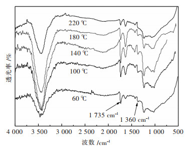 从图 6中以看出,抗压强度随着温度的升高呈逐渐下降的趋势,而成型炭比表面积在60~100 ℃时,有一个大的上升趋势,之后比表面积没有太大的变化.这主要是由于小分子物质水、乙醇等其他分子吸附在活性炭孔隙内,在温度低于100 ℃时,不易再排出,因此,聚醋酸乙烯酯固化后会将其堵塞在孔隙内,造成成型炭比表面积急剧减少.当温度超过100 ℃,达到水和乙醇的沸点,之前被吸附的小分子会在固化过程中排出孔道,从而打开封闭的孔隙,使比表面积急剧增加.从抗压强度看,在温度达到140 ℃以上时,抗压强度不断减小,这可能是随着温度的升高聚醋酸乙烯酯的稳定性降低,发生部分分解导致的. 图 7中显示了不同热处理温度制备的成型炭红外谱图,从图 7可以看出,2号峰(1 735 cm-1)和4号峰(1 360 cm-1)强度随温度不断增加,但温度超过140 ℃以后,峰强度明显降低,说明聚醋酸乙烯酯发生部分分解,尤其当温度达到220 ℃时,基本观察不到4号峰的存在,由此可知当温度超过140 ℃,聚醋酸乙烯酯的稳定性降低,会发生部分分解,导致强度下降,伴随比表面积增加.由耐水性实验得出,当固化温度超过100 ℃,所制备的成型炭耐水性能好,水煮10 h不发生破损;而60 ℃制备的成型炭,虽然抗压强度高,但耐水性差,水煮不到10 h,全部破损.