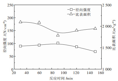 在操作条件为聚醋酸乙烯酯用量(黏结剂/活性炭)0.45 g/g、乙醇用量(乙醇/黏结剂)5 g/g、加水量3 g/g(水/黏结剂)和固化温度100 ℃时,考察不同固化时间对成型炭的影响,时间分别为30 min、60 min、90 min、120 min和150 min,其结果见图 8所示.