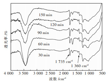 从图 8中可以看出,抗压强度的变化呈先增后减的趋势,而比表面积呈先减后增的趋势,在90 min时,抗压强度达到最大,对应的样品比表面积最小.主要是因为,黏结剂的固化需要一定的时间,随着时间的延长,固化反应不断的进行.当固化时间达到90 min时,黏结剂充分固化,强度较高,此时堵孔现象也最为严重,比表面积最低.当固化时间超过90 min以后,抗压强度不断减小,对应的比表面积不断增加,这可能是由于固化时间长,且温度一直处于100 ℃,达到水和乙醇等小分子物质的沸点,此时,被封堵在孔道内的小分子物质冲破孔口堵塞物,使孔道打开增加了比表面积,但却使抗压强度降低.为验证上述结论,观察图 9中各成型炭的红外谱图,从图 9可见固化时间超过90 min时,所制备的成型炭表面官能团类型及其特征峰强度基本不变,也即固化时间的增加并没有导致聚醋酸乙烯酯的分解.由此,可以推断上述解释具有一定的合理性.耐水性实验得出,在考察的固化时间30~150 min内,所制备的成型炭耐水性能良好,煮沸10 h后没有发生任何破损现象.