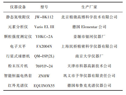 实验所用设备主要有:静态氮吸附仪用于测定活性炭比表面积和孔结构;元素分析仪测定活性炭各元素含量;球磨机用于活性炭球磨粉碎;粉末压片机用于粉体活性炭的成型;颗粒强度测定仪用于成型活性炭抗压强度的测定;电热套用于成型活性炭耐水性能的表征;红外光谱仪用于确定活性炭表面官能团.各仪器设备详细信息列于表 1中.