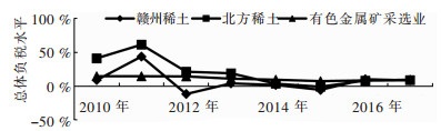 从稀土资源税改革与企业利润变动周期来看,赣州稀土和北方稀土的盈利变动态势大致相同. 2010—2011年,由于稀土价格的上升,稀土采选企业的利润空间急剧扩张.虽然国家及时调高了稀土资源税税额标准,但从量定额缺乏应有的价格弹性,2011年2家稀土企业核心利润率远远高于行业当年的平均水平.自2011年下半年以后,稀土价格一路下行,而企业仍旧执行2011年制定的高税额标准,价格下降,税额不减,税负过重又导致企业经济效益急剧下滑,产业发展极不稳定. 2015年实施从价计征改革后,在一定程度上缓解了稀土产品价格下行和企业成本上升的压力. 2016年赣州稀土与北方稀土利润率均有小幅上升,至2017年基本达到有色金属矿采选业的平均水平.这说明稀土资源税从价计征改革促进了企业税负的公平,使企业利润空间保持在合理区间内.根据资源价值差异而设置的不同资源税率,具有一定的合理性.