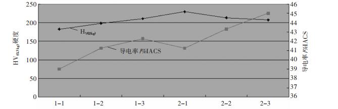 | 图 3 不同时效工艺下的硬度和电性能 Fig. 3 HV and electrical property for different aging processing |