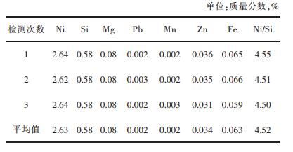 从表 1可以看出:此次实验材料的化学成分完全符合ASTM B888标准[10]中对于Cu-Ni-Si合金的要求。