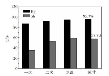 | 图 5 50 ℃时两次浸出和水洗后浸出率 Fig. 5 The leaching ratio of Hg and Sb after two leaching and water washing temperature 50 ℃ |