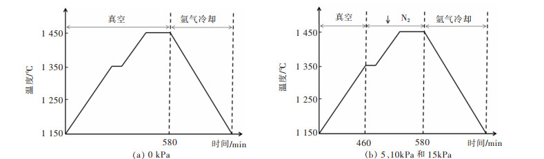 1 试验材料与方法 1.1 样品制备试验选择市售的WC、Co、TiC、NbC为原料,原料粒径及氧含量见表 1所列。按表 2成分配成原料,混合后选用无水乙醇为球磨介质、石蜡为成型剂, 使用行星式球磨机球磨,球磨时间为6 h,球料比为4∶1,固液比(即原料粉末质量与无水乙醇体积比)为4∶1。球磨结束后将料浆真空干燥后压制成PS21(20 mm×6.5 mm×5.25 mm)标准条状样品,分别在氮气压力为0(真空)、5、10 kPa和15 kPa下进行烧结,其中0 kPa的烧结工艺曲线如图 1(a)所示, 5、10 kPa和15 kPa的烧结工艺曲线如图 1(b)所示。最高烧结温度为1 450 ℃, 氮气在1 350 ℃时开始通入,保压时间为2 h,随后在100 kPa的氩气压力下进行冷却至室温。