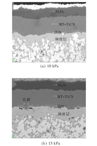 图 10所示为在10 kPa和15 kPa氮气条件下烧结的样品涂层后的截面电镜照片。可以看到,在10 kPa氮气条件下烧结的样品表面与涂层紧密接触,而在15 kPa氮气条件下烧结的样品表面与涂层结合处则存在较多的孔洞,原因是当氮气压力增加时,表面梯度层形成速度加快,各处梯度层形成速度差异也变大,易在表面形成不平界面或孔洞,从而使表面粗糙度增大。基体表面适当的粗糙度可通过机械锁合作用提高涂层的附着强度,而当基体表面太粗糙时,基体表面和涂层之间由于空穴的存在而使涂层附着强度下降[21],因此,在15 kPa氮气条件下烧结的样品由于在基体表面与涂层的结合处存在较多孔洞,导致涂层结合力下降。