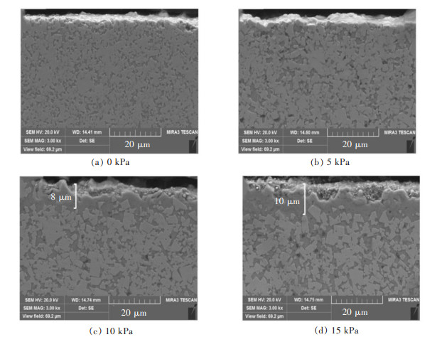 2 结果与讨论 2.1 表面形貌图 2所示为不同条件下烧结后合金截面的形貌照片。可以看出,在真空条件下烧结的样品整体为均匀结构;当氮气压力为5 kPa时,在合金表面未观察到梯度层;当氮气压力为10 kPa时,在样品表面出现了明显的梯度层,厚度约为8 μm;随着氮气压力升至15 kPa,样品表面梯度层厚度有轻微地增加,约10 μm,说明氮气压力的增大有助于梯度层的形成。