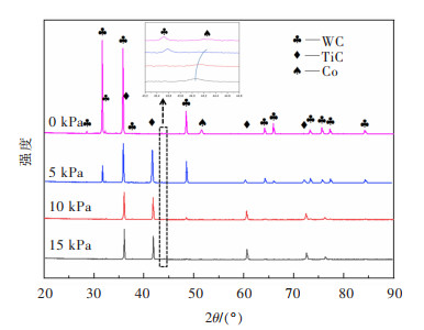 图 4所示为4组样品表层的XRD衍射图谱。可以发现当样品在真空中烧结后,其表面有WC和Co相,未发现有明显的TiC相衍射峰,原因可能是样品TiC含量较少,使XRD难以检测到;当样品在5 kPa的氮气压力下烧结,其表面的衍射结果显示有WC、TiC相, 未见明显的Co相衍射峰;随着氮气压力增大至10 kPa和15 kPa,即合金表面出现较明显的梯度层时,合金样品表面的TiC衍射峰增强,WC相衍射峰数量减少,同时出现微弱的Co相衍射峰,并且由于部分Nb,Ti和W的固溶导致Co相衍射峰向左偏移,说明表层梯度层的物相主要有TiC,WC和Co相。