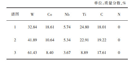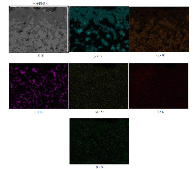 表 4所列为在氮气压力为15 kPa下烧结的样品的梯度层、过渡区域以及合金内部(如图 5所示)的EDS检测结果,图 6所示为相应的面扫描结果。结合表 4及图 6,可以得知梯度层为富Ti贫W层,Co呈岛状分布于梯度层中,Nb、C、N元素分布则未见明显梯度,尤其是N分布与文献[15-17]的结果不同,即本实验样品表层并未形成TiCN,EDS检测结果也显示N原子含量为0,主要的原因可能是本实验采用的氮气压力太小,无法使大量的N元素富集在基体表面与Ti、C形成TiCN。