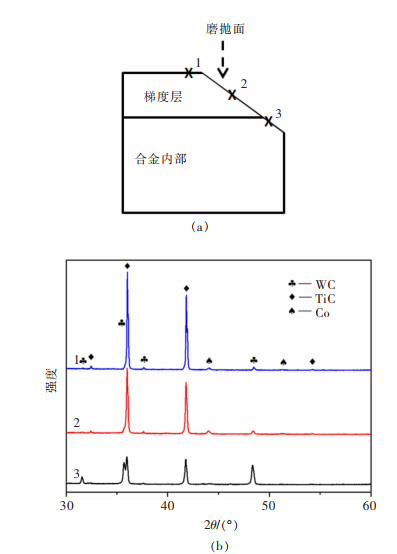 为了研究在梯度层形成过程中Ti是以何种形式向外迁移,将在15 kPa氮气压力下烧结的样品按如图 7(a)所示进行磨抛,随后在梯度层表面(点1)、中部(点2)以及靠近梯度层的合金内部(点3)分别进行X射线衍射分析, 其结果如图 7(b)所示。可以发现各层物相主要为WC、TiC和Co相,说明在梯度层形成过程中,Ti是以TiC的形式向表面迁移。