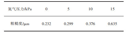 图 3所示为不同氮气压力下烧结样品的表面形貌。可以发现在真空下烧结的合金表面有零散分布的WC晶粒以及覆钴层[19];当氮气压力为5 kPa时,有较薄的片状物质覆盖在样品表面, 说明此时梯度层已经开始形成,但由于厚度太薄,因此未能在其截面的电镜照片上观察到该梯度层;当氮气压力为10 kPa和15 kPa时,样品表面呈疏松状。对4个样品表面粗糙度的测量,结果如表 3所列。由表 3可知,样品表面粗糙度随着氮气压力的增大而增大。