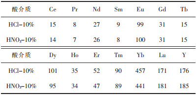 3)混合标准溶液:取单质浓度为1.0000 g/L混合稀土储备溶液,采用逐级稀释法分别配制成100 mg/L、10 mg/L混合稀土标准溶液,硝酸(1+9)介质。