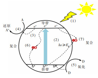 传统的半导体光催化材料以TiO2为代表,其在研究和开发中应用最为广泛,其光催化原理如图 1所示。半导体材料的能带结构由充满电子的低能级价带和未充满电子的高能级导带组成,价带和导带之间存在间隙,当TiO2被能量大于或等于禁带宽度的光照射时,价带中的电子吸收能量被激发跃迁到导带,同时价带上也相应地产生空穴,形成电子-空穴对。电子-空穴对在空间电场的作用下迁移到粒子表面,其中空穴可以与H2O和OH-发生反应生成羟基自由基·OH,电子能够与O2反应生成超氧自由基·O2-,这些自由基具有很强的氧化性,能够与有机污染物反应,将其降解为CO2和H2O等物质[3-4]。然而,TiO2为宽带隙半导体(禁带宽度是3~3.2 eV),而且仅可以吸收波长小于387 nm的紫外光,而紫外光仅占太阳光的5%,TiO2对太阳光的利用率低[2]。在光催化过程中,TiO2在受到光辐射产生的电子-空穴对复合率高,量子效率低,限制了TiO2的光催化活性[5]。在过去的几十年里,国内外研究者致力于通过各种方式对TiO2进行改性,以提高其光催化性能。杨传玺等总结了TiO2的掺杂、贵金属表面沉积、染料光敏化、半导体或导电聚合物复合5种改性方法,各种方法从不同侧面对TiO2进行改性,改性后TiO2的可见光光催化活性显著改善[6]。近年来,二维纳米材料作为新型光催化剂进入了人们的视野,特别是二维材料-半导体复合材料因其良好的电子传导率、大比表面积和高吸附性能引起了广泛的关注[7]。
