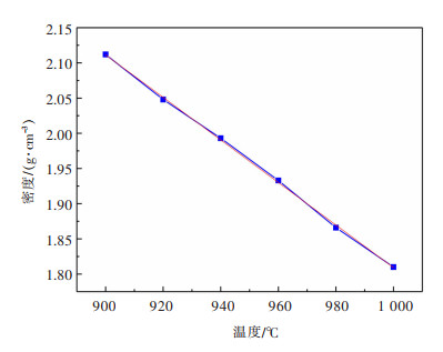 2 结果与讨论 2.1 温度对AlF3-(Li, Na)F-(Al2O3-Y2O3)熔盐体系密度、电导率及黏度的影响综合文献[22-23]的研究结果,可知在900~1 000 ℃温度范围内,Y2O3在不同比例的NaF-AlF3-LiF体系中的溶解度为2.0%~5.0% (质量分数) 之间; Al2O3在冰晶石体系内的溶解度在7.0%~10.0%(质量分数)之间。因此,实验过程Al2O3和Y2O3质量分数分别为10.0%和5.0%,均为饱和状态。