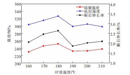 图 4 时效温度对AlSi10MnMg合金力学性能的影响 Fig. 4 Effects of aging temperature on the mechanical properties of AlSi10MnMg alloy |