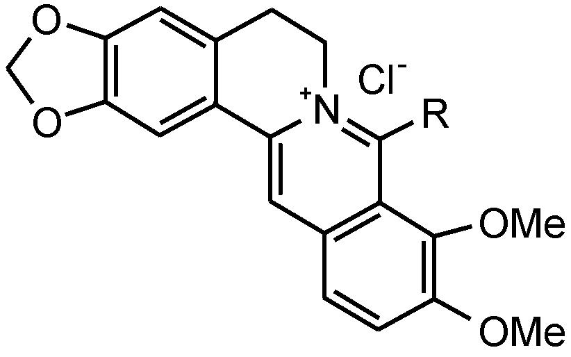 Figure 1 Structures of 8-BBR-C16 (R = -CH2-(CH2)14-CH3) and 8-dodecylberberine (R = -CH2-(CH2)10-CH3) |