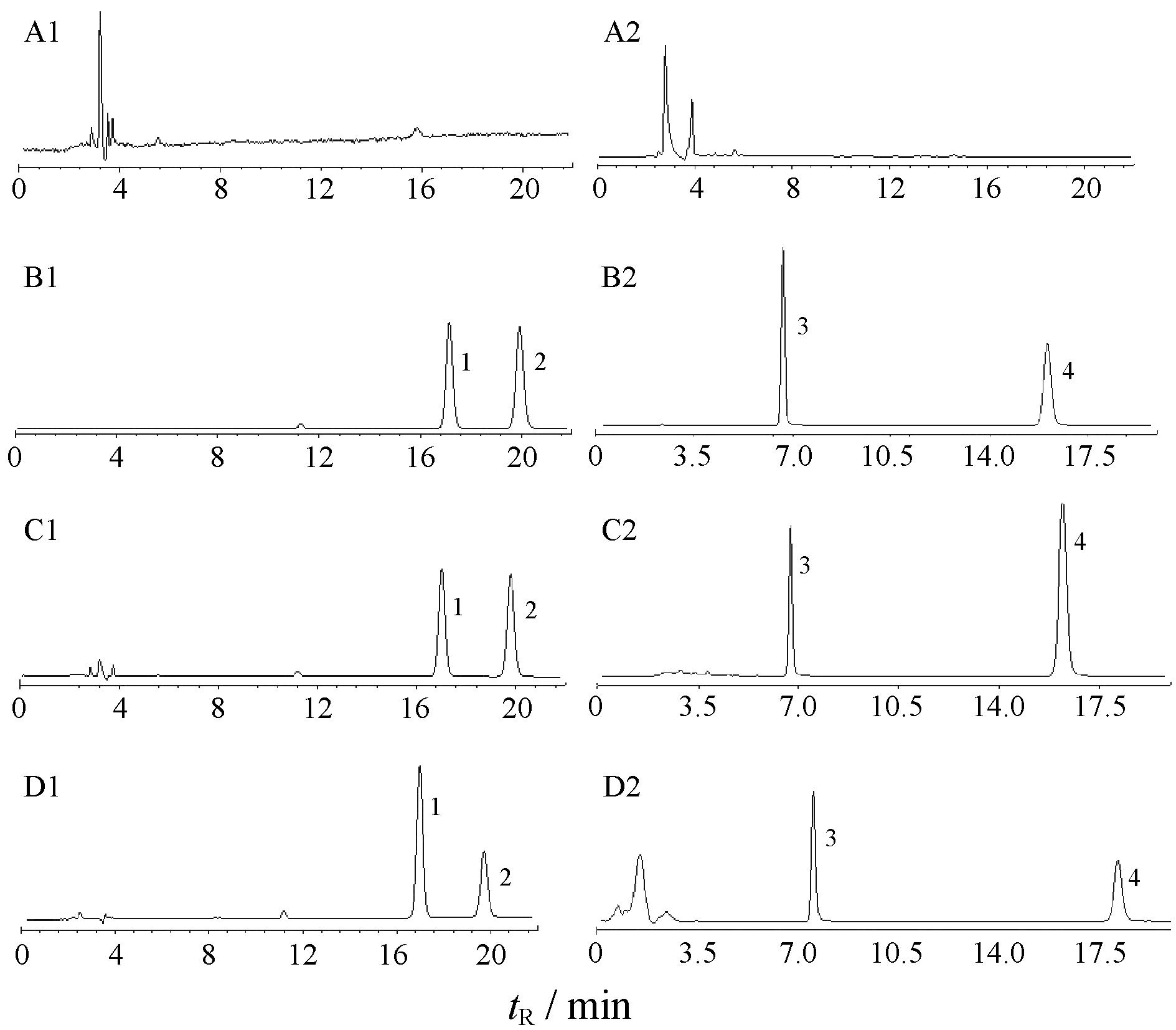Figure 2 Representative chromatograms of A1: Blank plasma; A2: Blank liver; B1: Standard BBR,B2: Standard 8-BBR-C16,C1: Plasma obtained 1 h after oral administration of BBR,C2: Plasma obtained 1 h after oral administration of 8-BBR-C16,D1: Liver obtained 1 h after oral administration of BBR,and D2: Liver obtained 1 h after oral administration of 8-BBR-C16. Peaks 1: Palmatine; 2: BBR; 3: 8-Dodecylberberine; 4: 8-BBR-C16 |