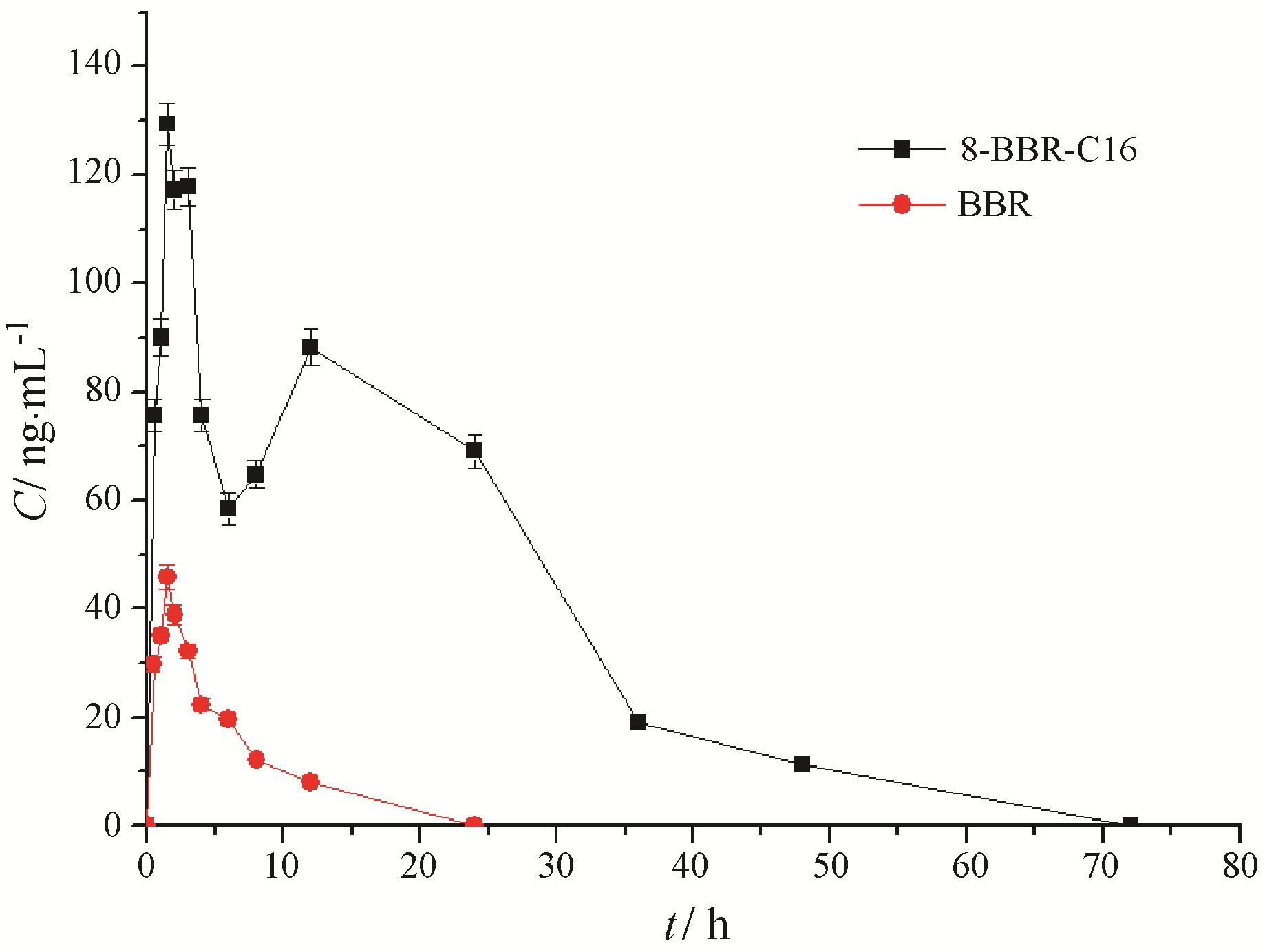 室温下放置24 h后、处理完在4 ℃放置24 h后、反复冻融3次后、于 -20 ℃放置两周后,这4种条件下BBR的高、中、低浓度血浆 (组织) 样品RSD为1.1%~3.3% (7.4%~10.4%)、1.6%~2.5% (8.0%~11.9%)、2.4%~4.1% (5.8%~11.5%) 和1.7%~3.0% (8.3%~11.4%),8-BBR-C16的高、中、低浓度血浆 (组织) 样品RSD为1.0% ~5.6% (10.8%~11.9%)、1.1%~4.8% (7.5%~9.8%)、2.1%~5.0% (8.6%~11.6%) 和1.5%~4.7% (8.8%~10.8%)。结果表明药物在所考察的条件下稳定,符合生物样品测定要求。 2 药动学和组织分布 2.1 药动学