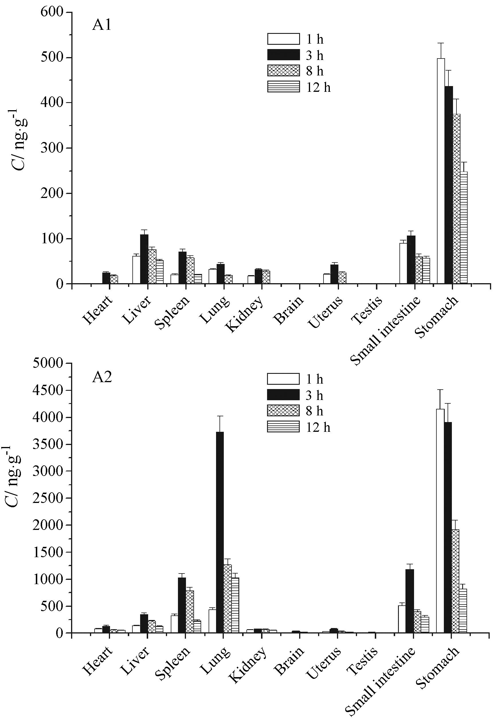 同时,于1、3、8和12 h等4个时间点分别断颈处死大鼠各5只,取心、肝、脾、肺、肾、脑、子宫、睾丸、胃和小肠,用生理盐水漂洗,用滤纸吸干水分后,于 -20 ℃保存。