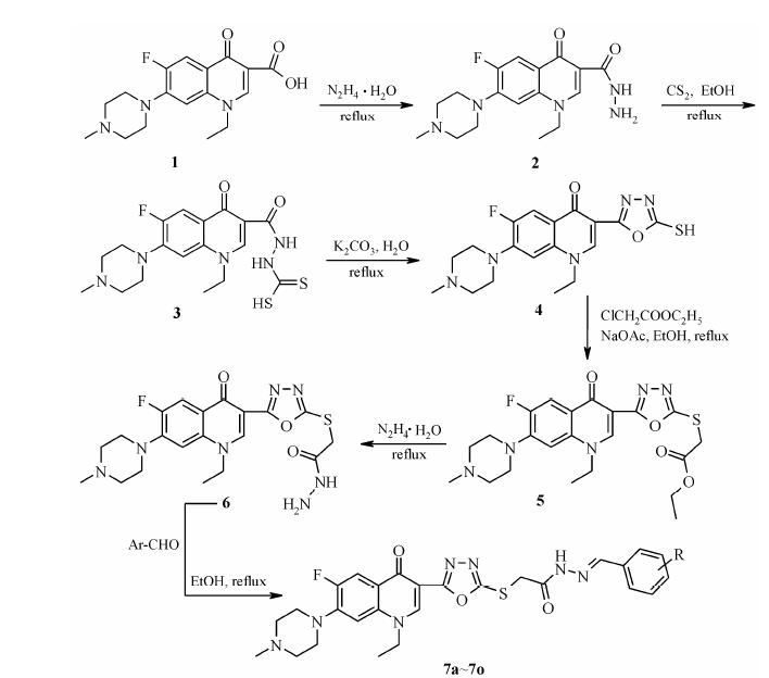 新药的研发起源于先导物的发现,基于机制的药物设计是发现先导物的有效途径,而对先导化合物的优化是促进其向成药性发展的关键环节[1]。拓扑异构酶不但是抗菌氟喹诺酮的作用靶点[2],同时也是抗肿瘤药物的重要靶点[3]。基于此,转化氟喹诺酮的抗菌活性到抗肿瘤活性备受关注[4]。近期研究发现,氟喹诺酮C-3羧基虽是抗菌活性必需的药效团,但并非是抗肿瘤活性所必要的,可被其等排体如酰胺、酰腙、杂环或稠杂环等替代[5, 6, 7],扩展了设计发现抗肿瘤氟喹诺酮先导物的新思路。为继续抗肿瘤氟喹诺酮课题的研究,一方面考虑到1,3,4-噁二唑类杂环化合物因具有抗肿瘤[8]、抗病毒[9]、抗菌[10]、抗炎[11]等多种生物活性已成为许多药物设计中的常用的药效团之一; 另一方面,酰腙结构中有N、O等供电子原子易与配体形成氢键,可提高与靶点结合的亲和力,而且酰腙的活泼亚胺 (CH=N) 双键能与大分子配体中的亲核基团如巯基和氨基发生亲核加成反应产生细胞毒作用,这可进一步提高其抗肿瘤活性[12]。另更重要的是,噁二唑杂环和酰腙均可作为氟喹诺酮C-3羧基的等排体,但在一个分子中同时存在对抗肿瘤活性有何影响仍值得探索。为此,基于药物设计的生物电子等排及药效团拼合原理,用噁二唑作为培氟沙星1的C-3羧基的等排体,酰腙为其修饰基,并以硫醚链相连接,设计合成了C-3噁二唑硫乙酰腙类目标化合物7a~7o,进而实现了药效团的叠加,希望活性得到进一步提高。