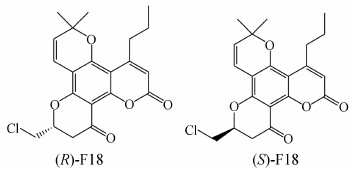 (+)-Calanolide A是从藤黄科红厚壳属植物中提取分离得到的吡喃型香豆素类化合物,是最早发现的具有抗HIV-1活性的天然产物之一,并在1996年被证实为HIV-1的RT抑制剂,尤其是可以抑制目前临床最常见的K103N和Y181C等两个耐药病毒株的特点,使其具有临床研究的价值[4, 5]。但 (+)-calanolide A本身开发为药物具有一些缺点,比如治疗指数 (TI) 较低、天然来源难以满足药物开发的需求、以及存在3个手性碳原子致使合成困难等。从20世纪90年 代起,本课题组开始致力于 (+)-calanolide A及其类似物的结构修饰和全合成研究,并取得了积极的进展[6, 7, 8, 9, 10, 11, 12, 13, 14]。研究结果显示 (±)-F18 (10-chloromethyl-11- demethyl-12-oxo-calanolide A) 比天然 (+)-calanolide A少两个手性中心,但其体外抗HIV-1活性 (EC50 = 7.4 nmol·L-1) 及治疗指数 (TI= 1 417) 均优于天然 (+)-calanolide A[11, 13, 14]。体外药效学实验证实 (±)-F18的抗HIV-1活性与奈韦拉平相当[13]。(±)-F18对临床主要耐药病毒株Y181C具有极高的抑制作用,EC50值为0.46 nmol·L-1。目前该化合物已经完成了临床前研究。 (±)-F18的结构中含有1个手性中心 (图 1),为探讨其光学异构体的抗HIV-1活性,本文采用制备型手性HPLC拆分并制备了 (R)-F18及 (S)-F18。两个对映异构体通常会表现出不同甚至相反的生物活性,因此,对 (R)-F18及 (S)-F18分别进行活性评价可为临床研究提供指导作用。