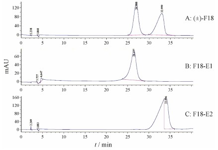 本文建立了消旋 (±)-F18手性高效液相色谱分离的方法。使用Sino-Chiral AD色谱柱 (10 mm × 250 mm, 5 μm), 以正己烷−异丙醇 (90∶10, v/v) 为流动相, 流速为5 mL·min−1, 检测波长为254 nm, 柱温为室温。如图 2所示, 所建立的方法能将两个对映异构体在40 min内手性分离, 其对映体的保留时间分别为26.9和32.9 min。分离得到的两个光学异构体最初分别命名为F18-E1和F18-E2, 测定二者的比旋度分别为: [α]D = +64.3 (F18-E1, 纯度97.4%); [α]D = −69.0 (F18-E2, 纯度98.9%)。