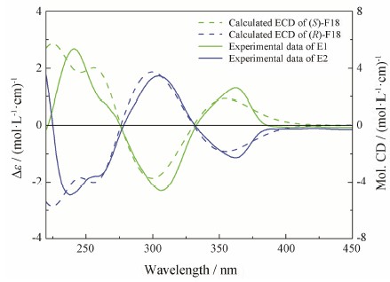 采用量化计算预测手性化合物的圆二色谱 (circular dichroism, CD), 并与实验图谱比较, 是解析CD图谱确定手性化合物绝对构型的常用方法[15, 16, 17]。本文测试F18-E1和F18-E2的CD结果显示 (图 3), F18-E1 (绿色实线) 和F18-E2 (蓝色实线) 的CD图谱呈现对映关系, 说明两者为一对光学对映异构体。理论计算结果显示, F18-E1的实验图谱与 (S)-F18 (绿色虚线) 的理论CD图谱相符, 推测其手性中心的绝对构型为S (图 3); 同理推断F18-E2的构型为R。