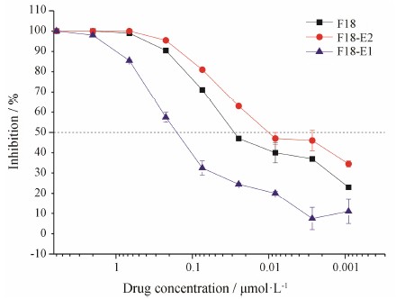 药物抗病毒活性的测定: 抗病毒活性试验的前一天, 将GHOST(3)-CCR5细胞100 μL (含1×104个细胞) 铺至96孔板。第二天, 分别将200 TCID50的病毒和3倍梯度稀释的F18、F18-E1、F18-E2 (起始浓度为6 μmol·L−1) 加入细胞中, 培养终体积为200 μL。同时设置无药孔和无病毒/药孔为对照。细胞感染48 h后, 加入荧光素酶试剂, 用 Inspire Victor 3多标记酶标仪1420测定每个孔的发光值RLU。采用公式 (无药孔RLU−有药孔RLU) / (无药孔RLU−无病毒/药孔RLU) ×100% 计算药物的病毒抑制率。通过GraphPad Prism software 5.0软件 (GraphPad Software Inc., La Jolla, CA) 计算药物抗病毒活性的EC50值。