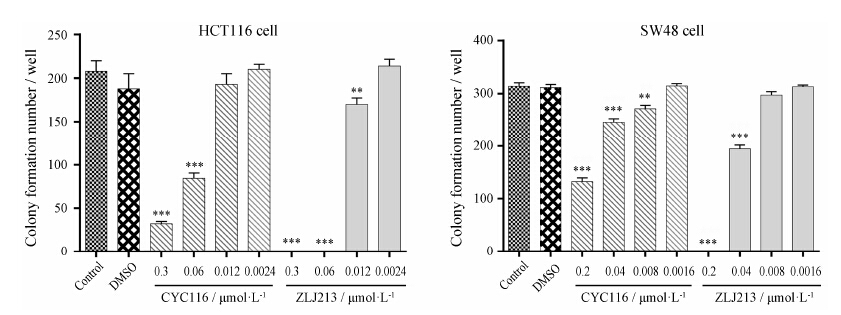 Figure 1 The effect of ZLJ213 on the colony formation of colon cancer cells. The HCT116 and SW48 cells were assayed for their ability to form colonies following 24 h of treatment with indicated concentration of ZLJ213 or control in DMSO followed by 14 days of culture in full-serum media. Colonies were counted as described in Methods. n = 3, x± s. **P < 0.01, ***P < 0.001 vs control group |