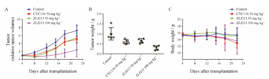 人结肠癌HCT116裸鼠异体移植瘤实验雌性BALB/c裸鼠购自北京华阜康生物科技有股份有限公司 (合格证号: SCXK (京) 2014-0004)。无菌条件下, 剥离传代于裸鼠腋下的HCT116结肠癌肿瘤, 去除筋膜, 剪碎瘤组织后分成大小均一的2~3 mm瘤块, 接种于BALB/c裸鼠左腋下。待肿瘤平均体积达到100~150 mm3时, 将动物随机分为4组, 分别为溶剂对照组、CYC116 50 mg·kg−1剂量组、ZLJ213 50 mg·kg−1和100 mg·kg−1剂量组。各给药组每日灌胃给药一次, 每周给药6天, 共给药16天。每周两次使用游标卡尺测量瘤体积, 计算相对肿瘤体积 (relative tumor volume, RTV = 长×宽×宽/2) 及相对肿瘤增殖率 (relative tumor growth rate, T/C)。实验结束处死动物, 剥离肿瘤并称重, 计算肿瘤生长抑制率。部分肿瘤组织于−80 ℃冰箱保存用于后续机制研究。