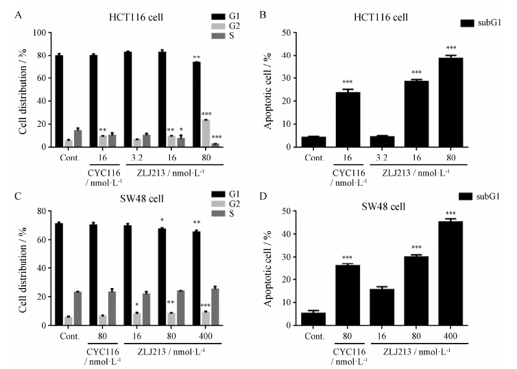 流式细胞术分析细胞周期分布及凋亡情况ZLJ213及CYC116处理结肠癌细胞72 h后, 将细 胞用预冷的PBS洗2遍。用胰蛋白酶-EDTA消化, 以含10% 胎牛血清的DMEM培养基终止消化。4 ℃, 800 r·min−1条件下离心5 min, 收集细胞。弃去上清液, PBS洗2遍后置于预冷的70% 乙醇中, 于−20 ℃冻存24 h以上后取出, 于4 ℃, 800 r·min−1条件下离心5 min, 彻底去除乙醇。PBS清洗2遍, 将细胞重悬, 加入PI染液 (0.1 mg·mL-1 PI, 0.02 mg·mL-1 RNase A, 1 mg·mL−1柠檬酸钠和0.3% Triton X-100), 混匀后于37 ℃避光放置0.5 h, 过300目筛, 在流式细胞仪上计数10 000个细胞, 分析细胞周期。