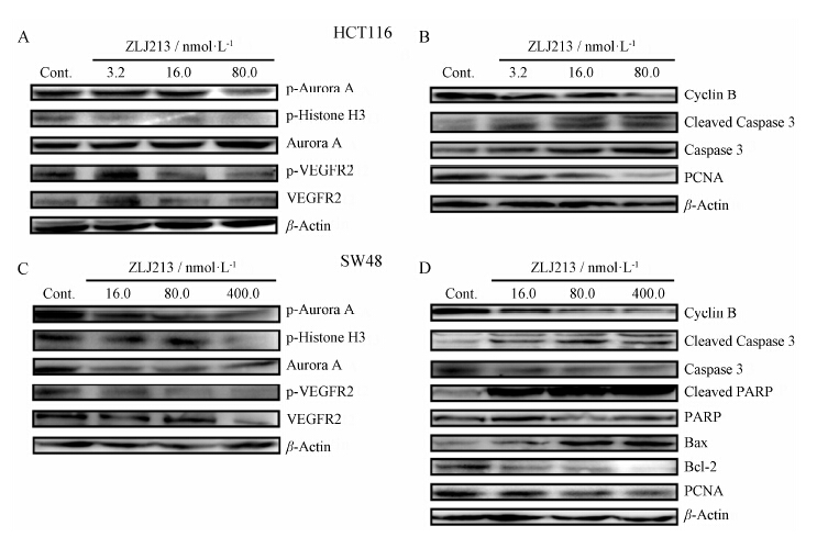 ZLJ213处理HCT116细胞72 h后, 在80.0 nmol·L−1剂量下, 可明显抑制p-Aurora A及p-Histone H3的表达, 而对Aurora A的表达无明显影响 (图 4A)。在16.0和80.0 nmol·L−1处理的细胞中, 可见p-VEGFR2的表达水平显著降低。同时, 可以剂量依赖性地抑制Cyclin B及PCNA的表达, 并上调凋亡相关蛋白cleaved Caspase 3的表达 (图 4B)。