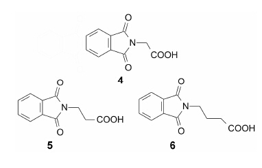 将甘氨酸、β-氨基丙酸或γ-氨基丁酸 (调节不同的链长) 与邻苯二甲酸酐反应生成的化合物4、5和6抑制TNF-α的活性很弱, 在数百微摩尔浓度下, 抑制率达不到50%, 提示简单的羧酸链取代没有活性。