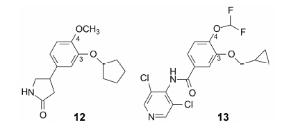 构效关系研究表明, PDE4抑制剂的重要药效团特征之一是含有3, 4-二烷氧苯基片段, 例如PDE4 抑制剂罗力普兰 (12, rolipram) 和罗氟司特 (13, roflumilast), 而且3位的烷氧基的体积大于4位的甲氧基为宜 (Kodimuthali A, Jabaris SSL, Pal M. J MedChem, 2008, 51: 5471−5489)。因而, 下一步的结构优化的目标是同时提高对PDE4和TNF-α抑制活性。