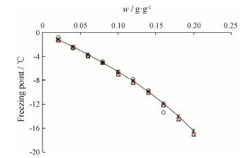 Figure 2 Comparison of freezing point data of NaCl solutions obtained by air humidity cryoscopy (□),cooling curve method (△),DSC method (○) and reported by literature (×) |