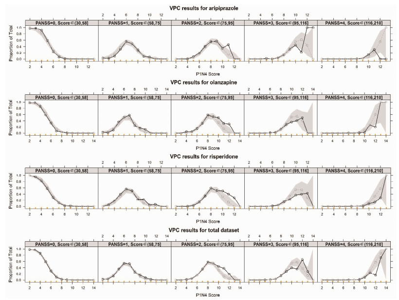 模型拟合得到的参数结果如表 3中所示, 从表中可以看出各参数的RSE值均小于30%, 说明模型参数估算精密度较好, 参数估算较为准确, 且不同药物模型计算得到的收缩(shrinkage)均较小( < 20%), 说明模型拟合较好, 预测结果可信。采用基于1 000次仿真的内部验证方法VPC用于验证模型的拟合优度以及预测性能, 结果显示(图 1)不同药物以及全部数据的各个分区间均具有较好的模型拟合效果, 证明选出的P1N4可以较好地反映阿立哌唑、奥氮平以及利培酮治疗下精神分裂症的5种不同的疾病状态。