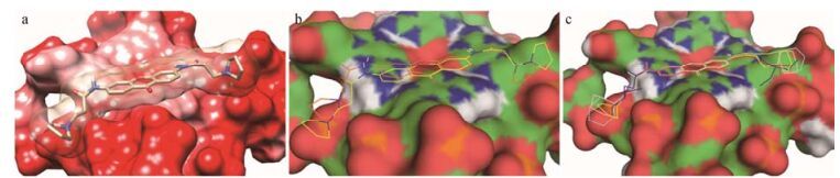 分子对接研究中的结合能数据列于表 2, 其中代表性化合物10c的结合构象列于图 1a (受体表面红色表明电负性区域)。研究中发现, 每个化合物的母核部分都可以对接到四分体表面上类似于10c的位置, 并且侧链都伸向1KF1的负电区。在图 1c中可以看到10a ~10e的母核对接位置相同, 只是侧链上末端氨基位置略有不同。这一结合方式与文献中所报道的“线型插入”方式相一致[12]。数据显示, 10a ~10e比9a ~9e有更低的静电能与总结合能。在图 1b中可以看到, 10c比9c的末端氨基更深入于1KF1沟槽中的负电区, 因此导致了更强的静电作用。