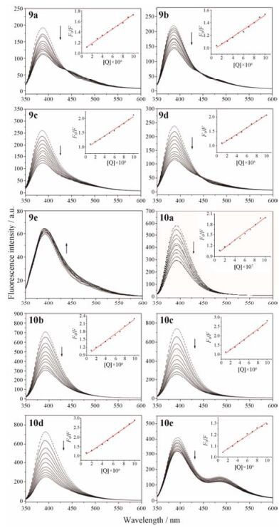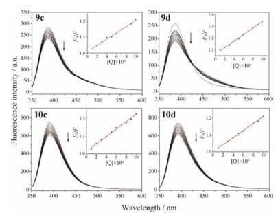 Figure 3 Fluorescent emission spectra of 9c, 9d, 10c, 10d that titrated with ctDNA. The arrow indicates the fluorescence changes upon increasing [Q] concentration. The inset is plot of F/F0 versus [Q] |